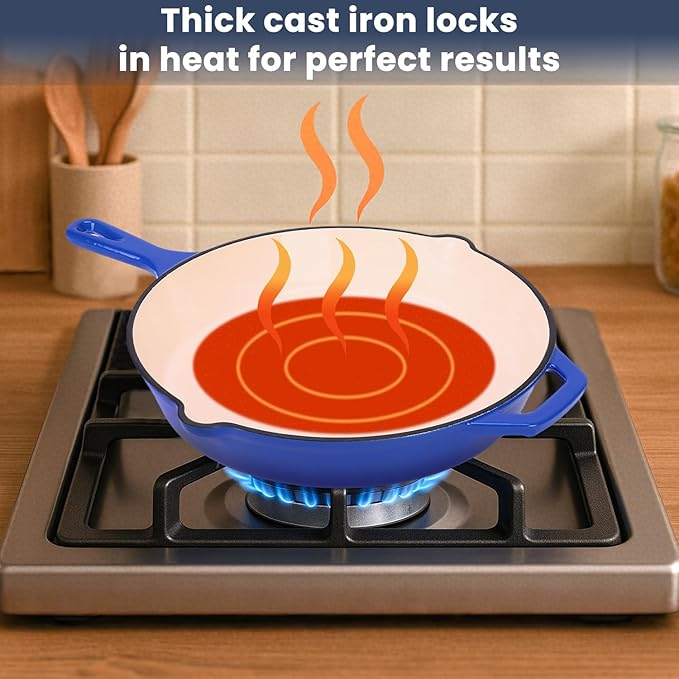 - 【Heat Retention & Even Heating】The unique design of our cast iron pots and pans set spreads heat evenly from bottom to sides. That means no more hot spots or half-cooked meals. The snug-fitting lids, typical of quality cast iron cookware, lock in moisture, yielding tender pot roasts and flavorful stews. And even when you take it off the heat, it stays warm for a long time, so you can serve seconds hassle-free