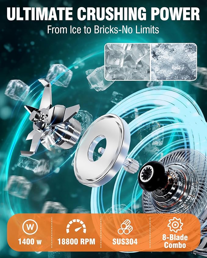 - ICE CRUSHING EXPERT: Equipped with a 1400W motor and 8-hardened 304 stainless steel blades, this commercial blender for restaurant achieves 18800RPM to easily blend ice, carrots, and hard ingredients in seconds, delivering the reliable high performance that busy environments need daily.