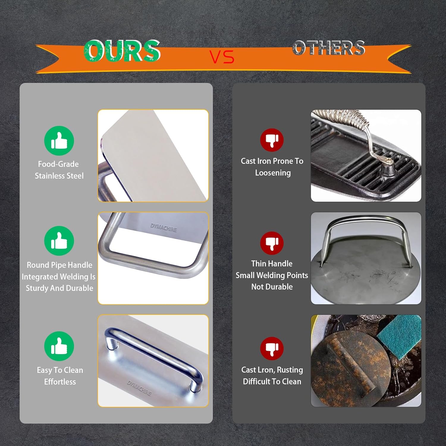 - Enjoy Your Burger in Seconds - Efficiency for cooking. DYMACHINE burger press helps cook your burger more quickly, you can easily exerting pressure to make food complete cooking faster with this heavy duty plancha para cocinar, adding a unique flavor, press out the grease for healthy cooking, much easier to use than griddle spatula or forming by hand.