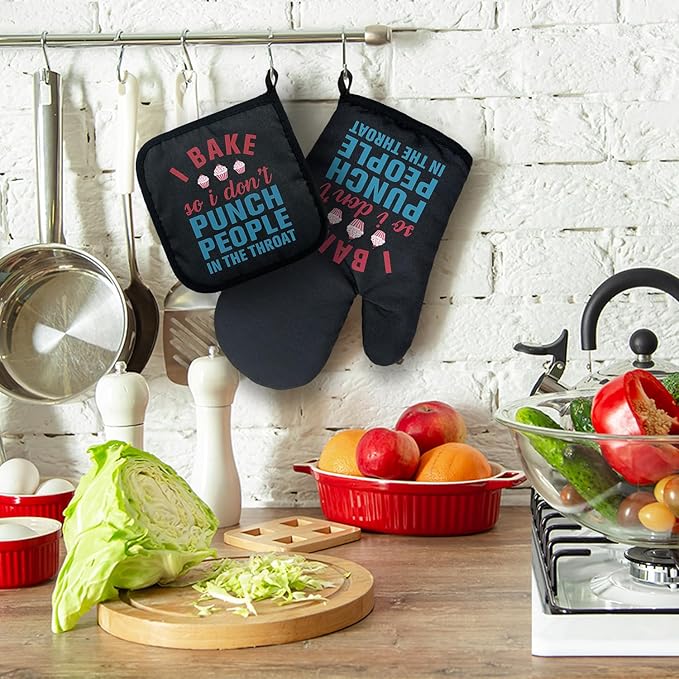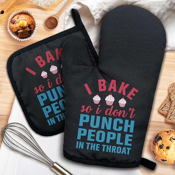 ZHANTUONE I Bake So I Don't Punch People in The Throat Funny Heat Resistant Oven Mitts and Pot Holders Set with Silicone Non-Slip, Women Bakers Cooking Baking Gadgets, Gifts for Chef Hostess Mom