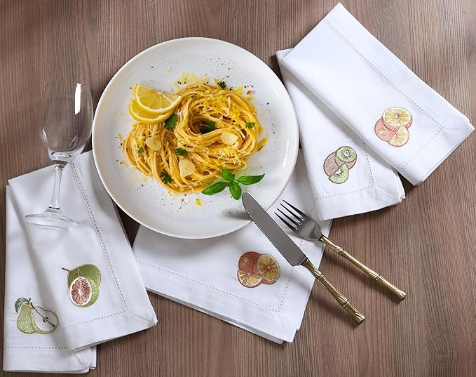 - Elegant Embroidered Motif Napkins – Set of 12 white cotton dinner napkins with classic embroidery and hemstitched design, ideal for weddings, parties, and holiday dining.