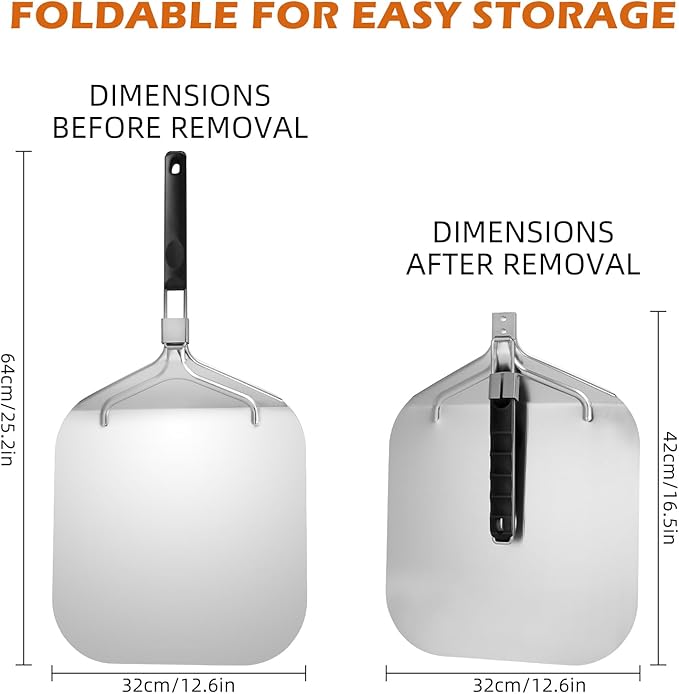 - 【Material and Size】: Our metal pizza paddle spatula is crafted from high quality grade aluminum, the metal pizza peel is moisture resistant and will not chip, bend or crack. Folded dimensions: 12.6 inch x 16.5 inch, Extended dimensions (with handle): 12.6 inch x 25 inch. Our 13 inch pizza peel is perfect for handling pizzas of various sizes, These features make our aluminum pizza peels a must-have accessory for your outdoor pizza oven
