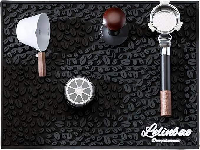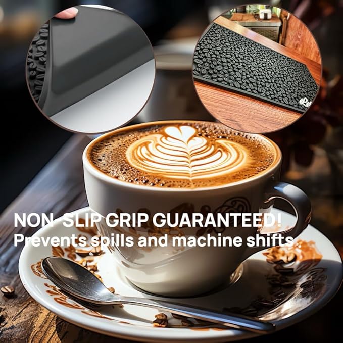 - 6️⃣NON-SLIP SAFETY SHIELD – The textured surface of this esspresso machine mat grips your coffee machine, grinders, and tools firmly, and the underside locks the mat firmly on countertops, preventing accidental slips during intense brewing sessions. Keep brewing station steady & safe!
