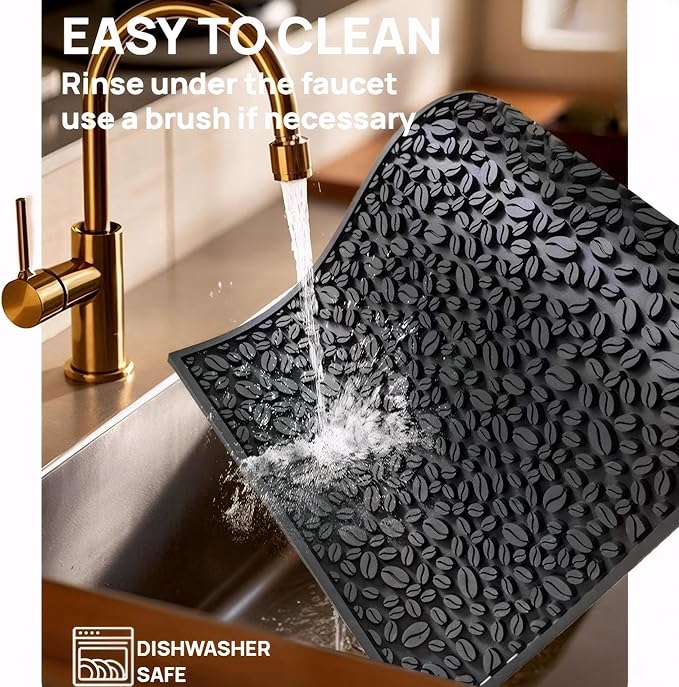 - 2️⃣HEIGHTENED EDGE DESIGN -Stop Spills & Grounds Chaos! The raised edge of our coffee machine mat features 3D coffee bean textures, it can catchs spills and coffee grounds more easier, no more messy leaks onto countertops. Realistic coffee bean patterns camouflage stains naturally, keep your countertop beautiful and clean at all times.