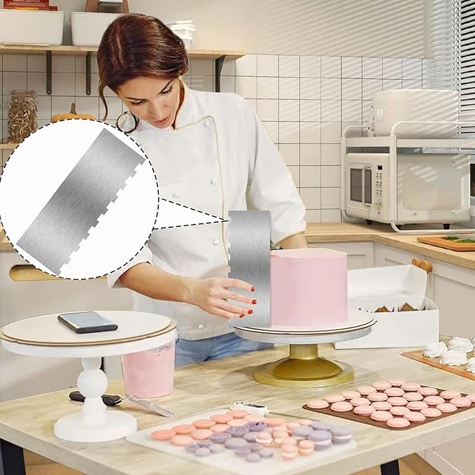 - What’s Included Each package includes 2 stainless steel cake scraper with 2 patterns (smooth edge and striped edge). Measuring 8.7 inches, it’s the perfect size for handling cakes of all shapes and sizes. Whether you’re a beginner or a pro, this tool will help you create beautiful, professional-quality cakes every time