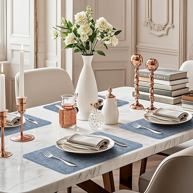 Vinly Placemats Set of 6 - Waterproof Wipeable Faux Leather Table Place Mats Heat Resistant Anti Slip Table Mats for Dining, Indoor, Outdoor, 15.8" x 11.8" (Blue,)