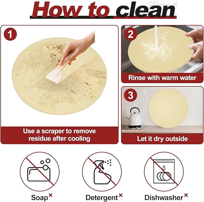- Easy To Clean: Cleaning is simple—once the pizza stone has fully cooled, gently scrub it with warm water or wipe it with a damp cloth. Do not use soap or detergent. After cleaning, let it dry completely before storing. It is normal for the pizza stone to change color over time with use