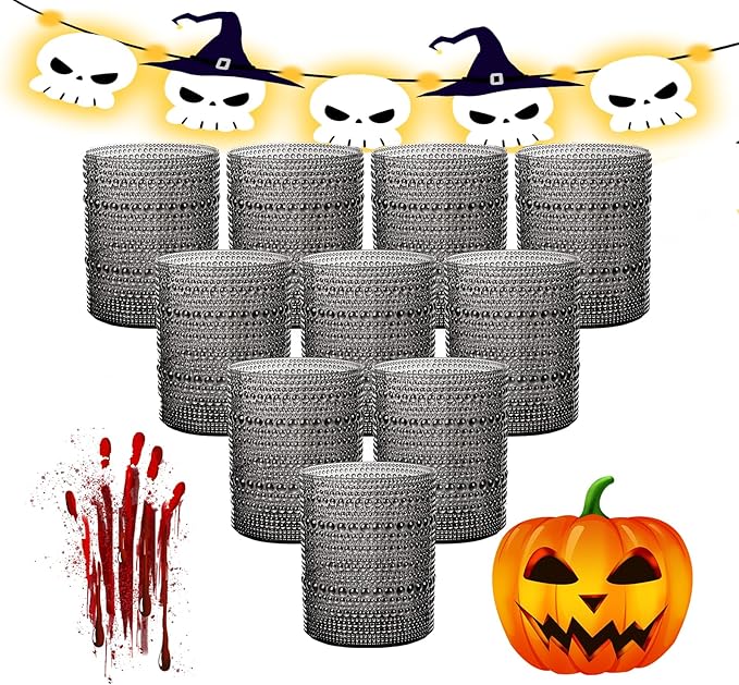 YOUBET 24PCS Plastic Drinking Glasses - 14OZ Black Hobnail Drinkware Glasses - Vintage Glassware Textured Beaded Cups for Water, Beer, Whiskey, Juice and Various Mixed Drinks, halloween