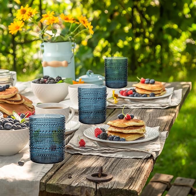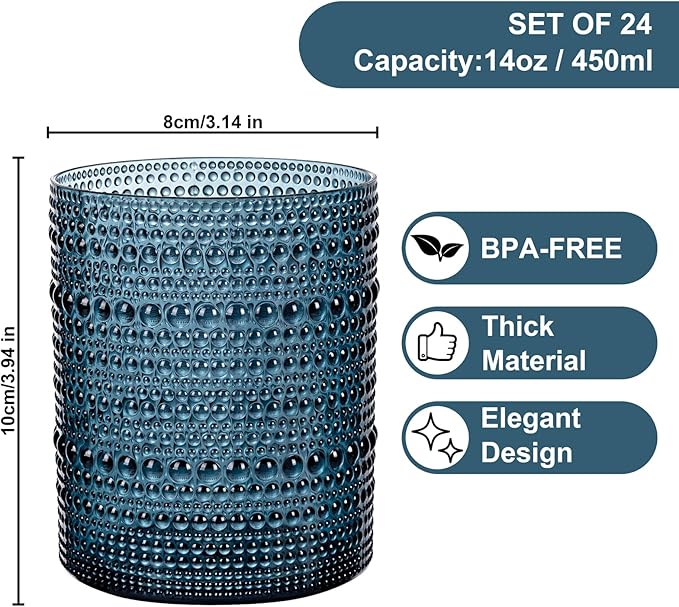 YOUBET 24PCS Plastic Hobnail Drinking Glasses - 14 Oz Blue Vintage Glasses Drinkware - Disposable Beaded Cups for Juice, Wine, Party