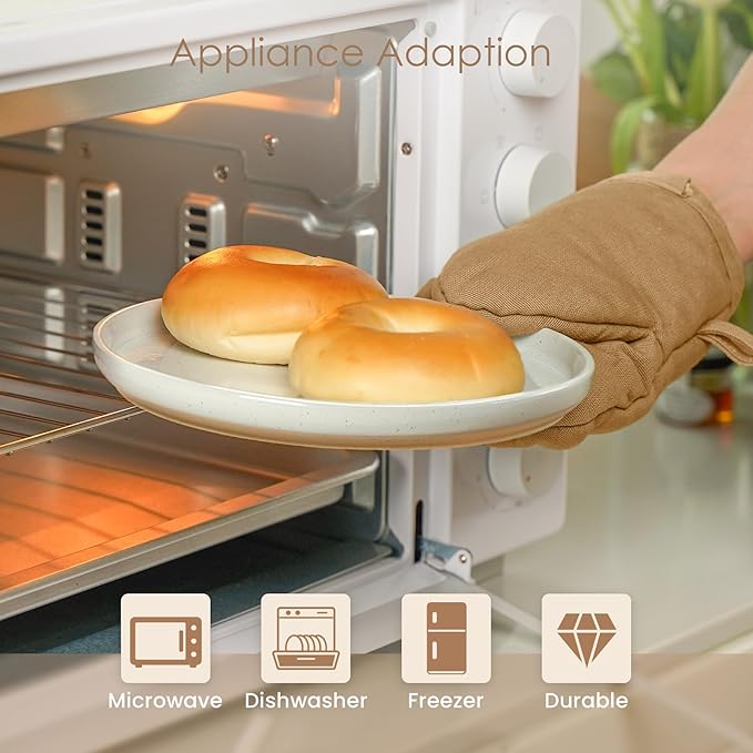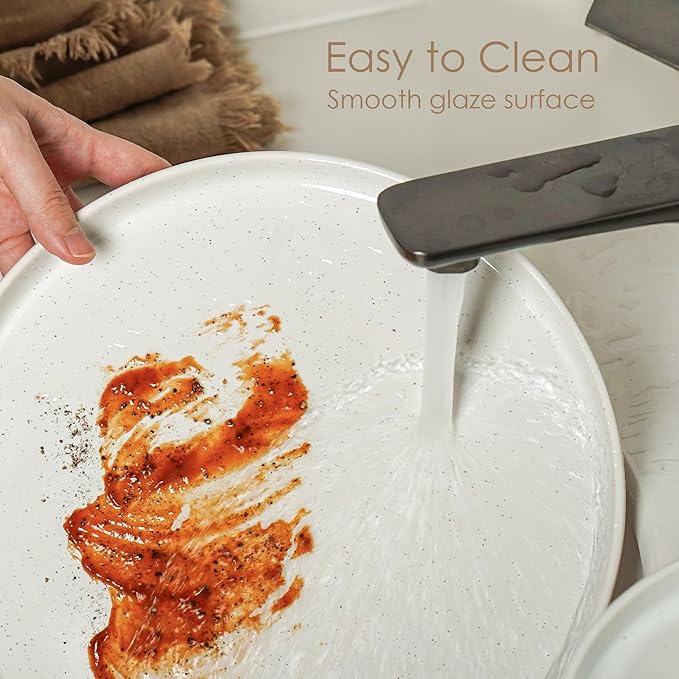 - Rustic Speckled & Matte Terracotta Underside Design – This ceramic plates and bowls set adds earthy sophistication to your table. Inspired by Mediterranean pottery traditions,each piece features a hand-textured, unglazed base that exudes rustic charm while providing exceptional grip—no more slipping on marble countertops or polished wood surfaces. The warm, muted terracotta tones create a striking contrast with modern tableware, blending seamlessly into farmhouse, bohemian, or minimalist settings.