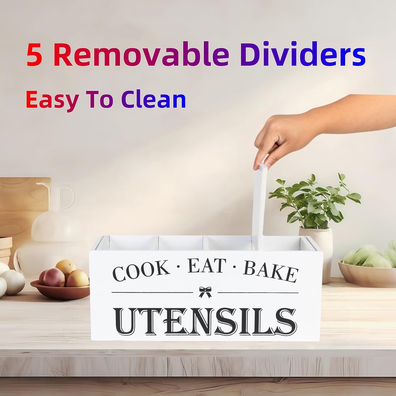 Utensil Holder,Extra Large Wooden Utensil Holder For Kitchen Counter,Cooking Spatula Organizer,Big Storage Caddy With 4 Compartments Flatware Spoon Tool Cutlery(White)