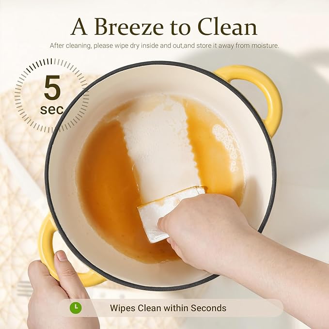 - Effortless Cleaning & Safety First: The flat and smooth enamel surface not only delivers a superior cooking experience but also makes cleaning a breeze. Easily remove food residues with a gentle wipe from a soft sponge or cloth. Additionally, we've included a cotton heat-resistant cap, ensuring a comfortable grip and safeguarding you from burns when handling the pot's handles and lid.