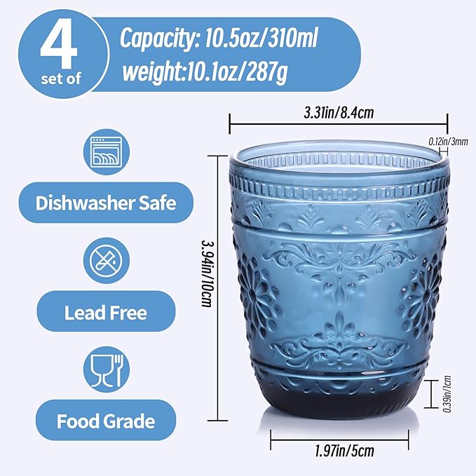 - Classic Design: The gorgeous colored floral embossed design,vintage color and aesthetic appeal give these water glasses a unique, classic charm, making it easy to match with other items you already own, such as pitchers, bowls or plates, adding a classic touch to your drinkware collection. Retro look while still being modern enough to use daily.