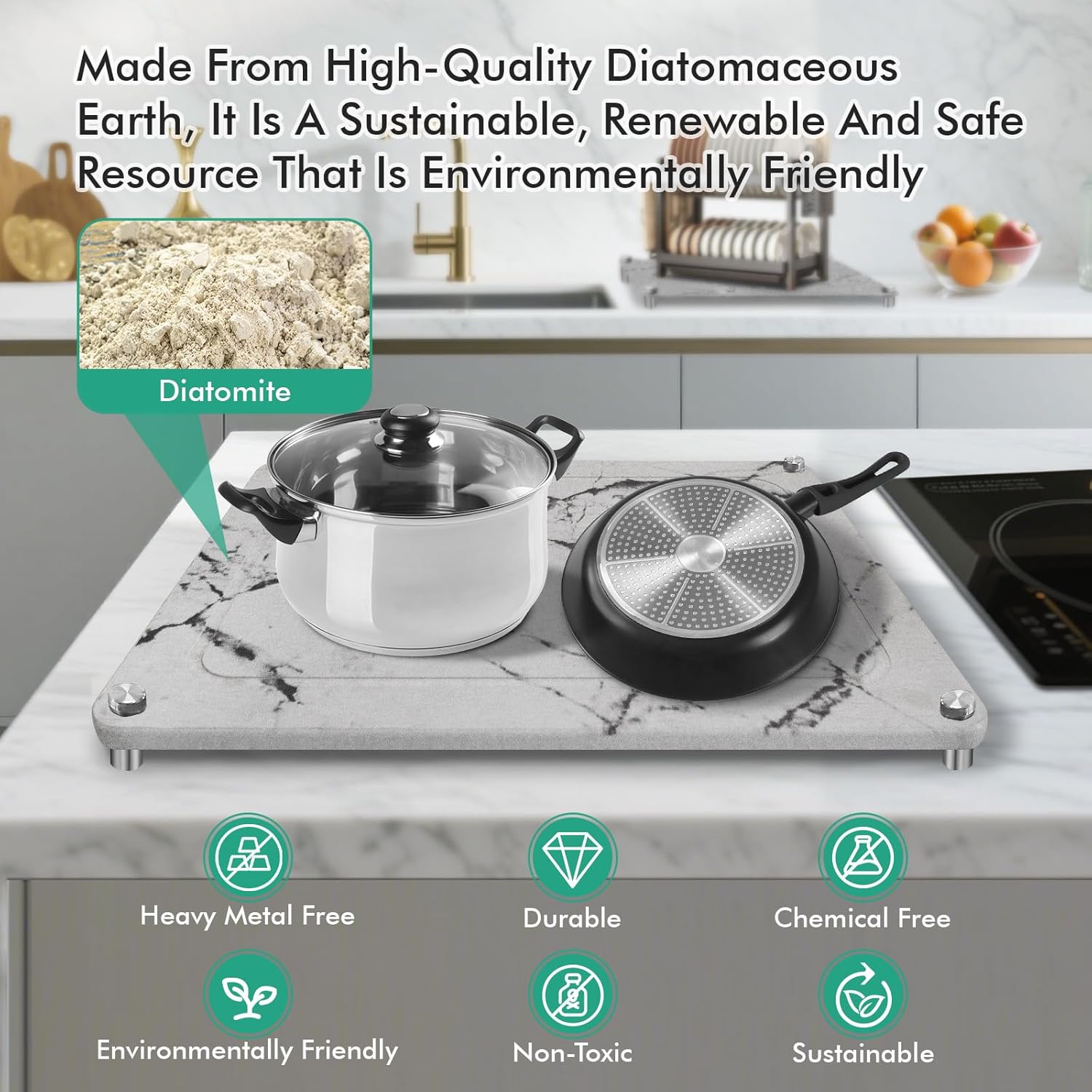 - 【Environmental Protection & High Quality Diatomaceous Earth】:A natural mineral material mainly formed by diatom plants, it is a sustainable and renewable resource. Is "breathing" natural diatom material is known as the "grass of the ocean". It is a food grade material that chemical free and heavy metals free. Our stone drying mat's high-purity environmentally friendly material carefully cares for the health and safety of families. Our kitchen countertop mats are durable and sustainable, making a contribution to our environment.