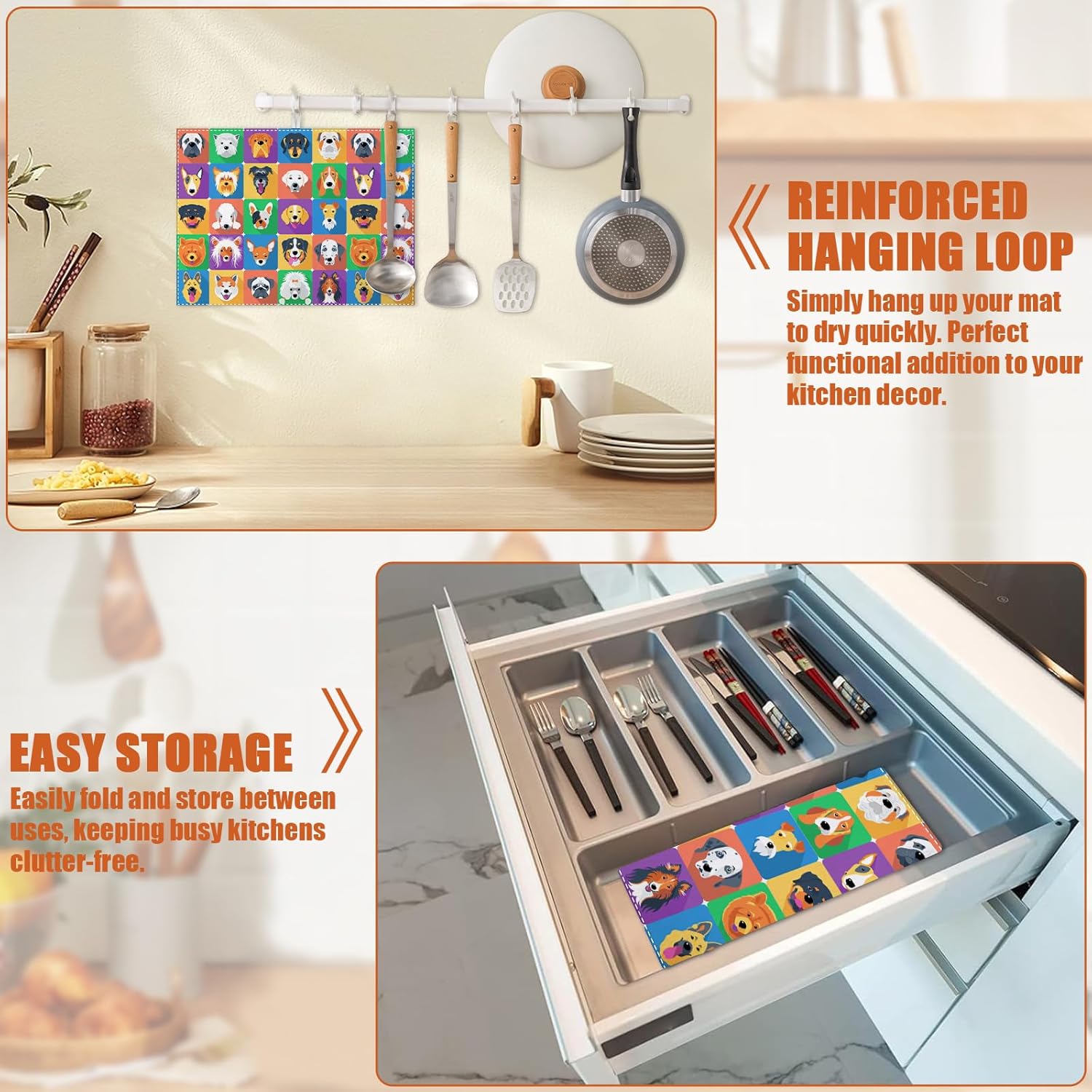 Cute Dogs Dish Drying Mat for Kitchen Counter Microfiber Absorbent Dish Kitchen Drying Mat Draining Reusable Washable for Dishes/Utensils/Counterto