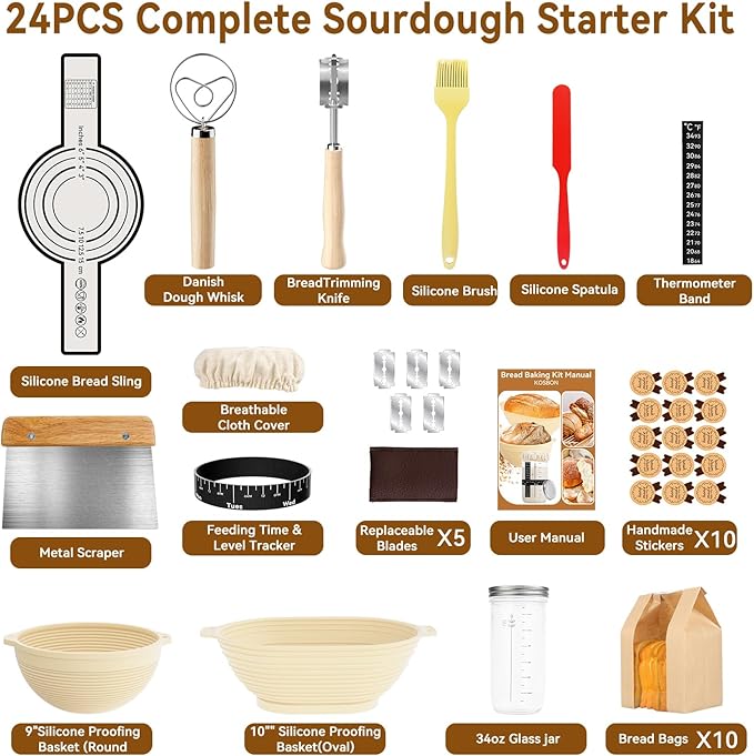 - 【24PCS Complete Sourdough Starter Kit】Ideal for beginners and pros, this complete set includes 9” Round Silicone Bread Proofing Basket&10'' Oval Silicone Bread Proofing Basket, a 34oz starter jar, 10 bread bags&stickers, 5pcs replaceable blades various bread making tools, bread sling, bread lame, scraper etc and more. No more hunting for tools mid-recipe!