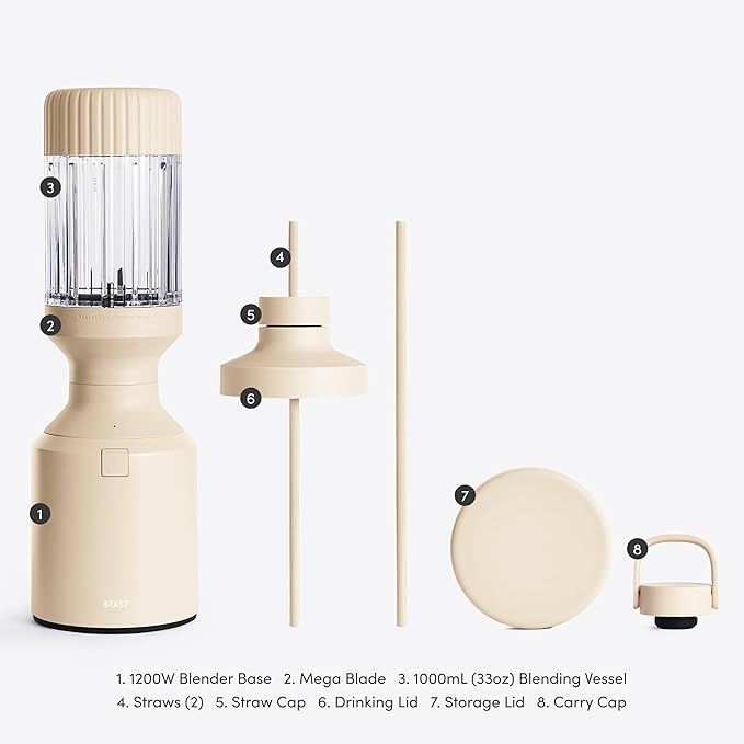 Beast Mega 1200 | Premium Countertop Blender | Smoothies, Shakes, Sauces, Dips, Soups | Blends Ice and Frozen Fruit | Includes Extra Lids and Straw System | 1200W | (Sand, 120V)