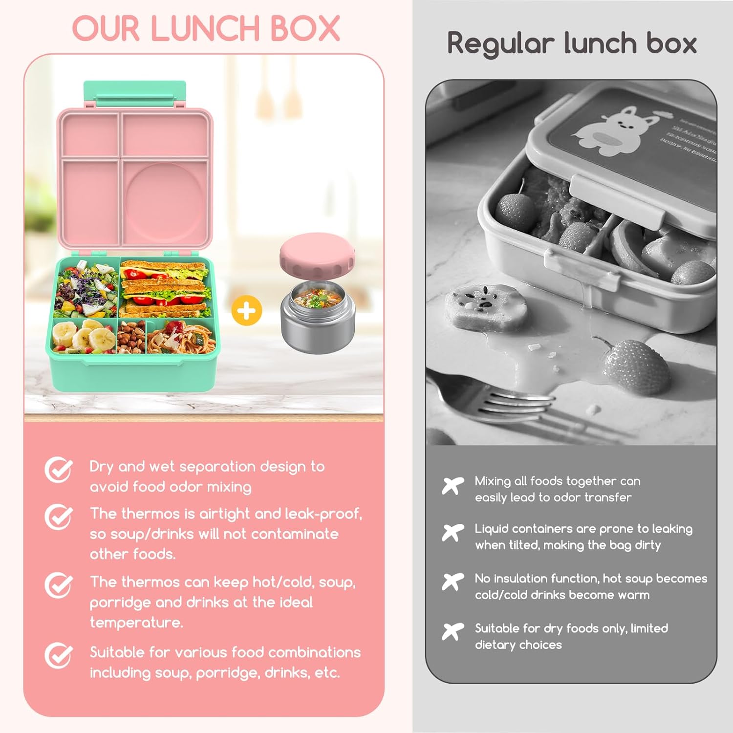 - 100% Leak-Proof: Our lunch box lid uses a silicone seal to seamlessly fit the edges of each compartment, so that no odors can mix or transfer between compartments. Hot soup/cold drinks can be stored separately in the thermos, and say goodbye to the messy backpack caused by spilled food.