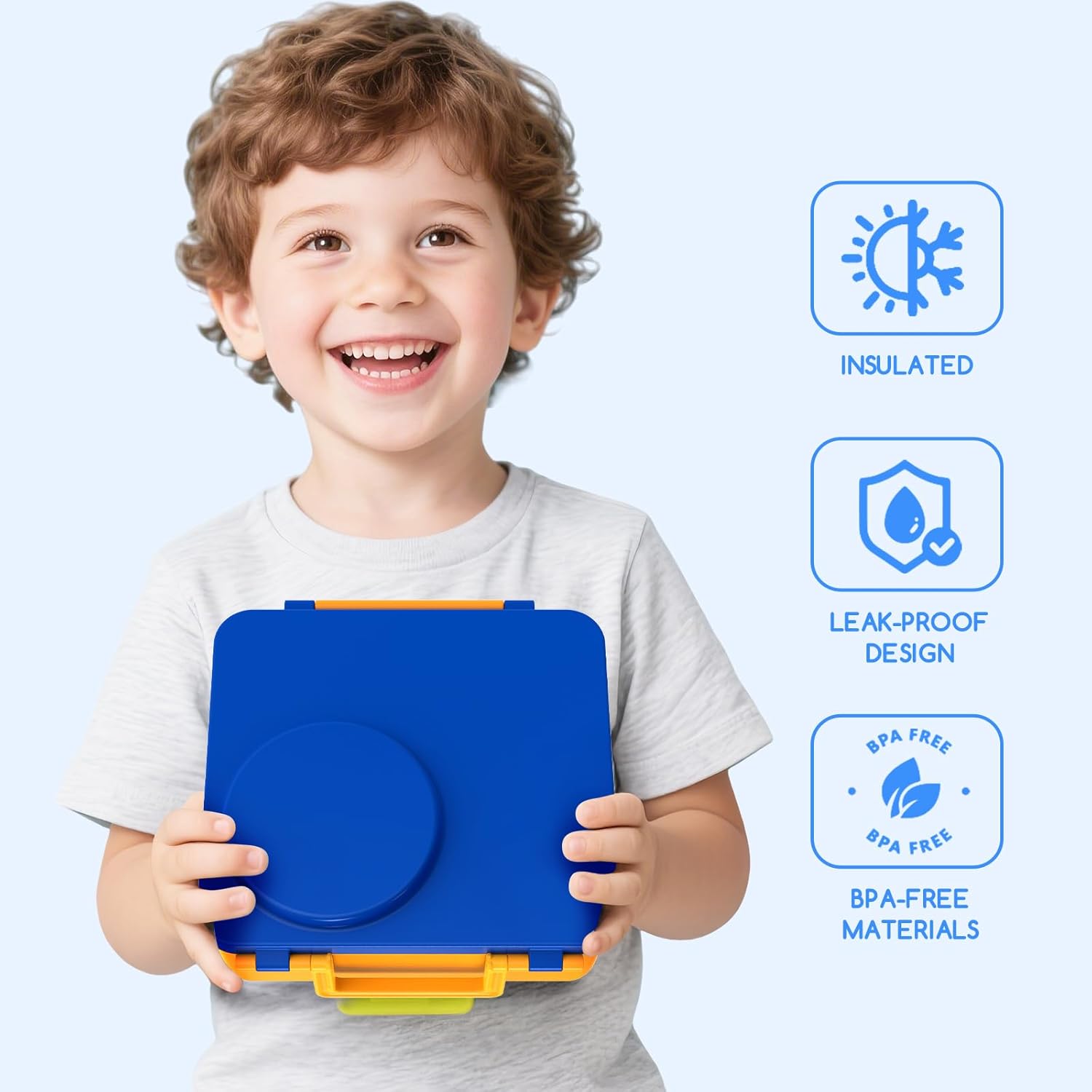 Bento Box for Kids - Leak-Proof Lunch Box with Insulated Thermos Food Jar - 4 Compartments, 1 Removable Divider, 1Spoon, 1 Fork - Dishwasher Safe, BPA-Free (Blue)