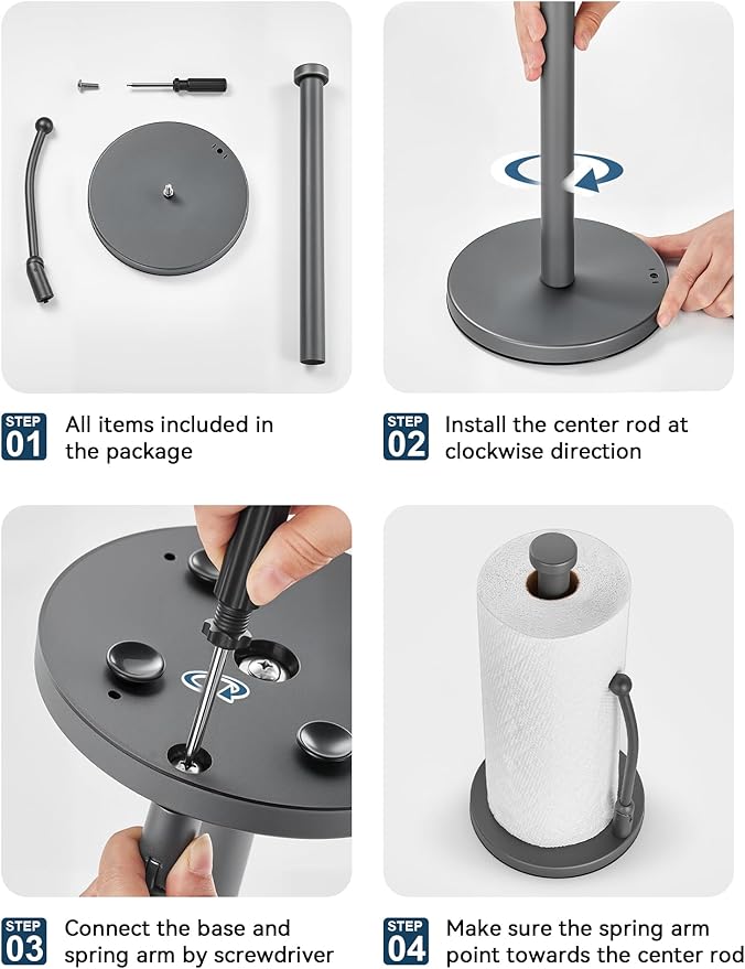 - Suction Cups Design: Equipped with 4 suction cups under the base, ensuring a firm grip on countertops, dinner tables, etc. Avoids sliding and skidding, a must-have standing paper towel holder for your home.