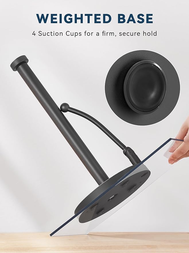 - Premium Roll Dispenser: Stable weighted base with suction cups to stay the paper towel holder in place when you are tearing paper sheets. It also prevents the mental scratching of your countertop or table.