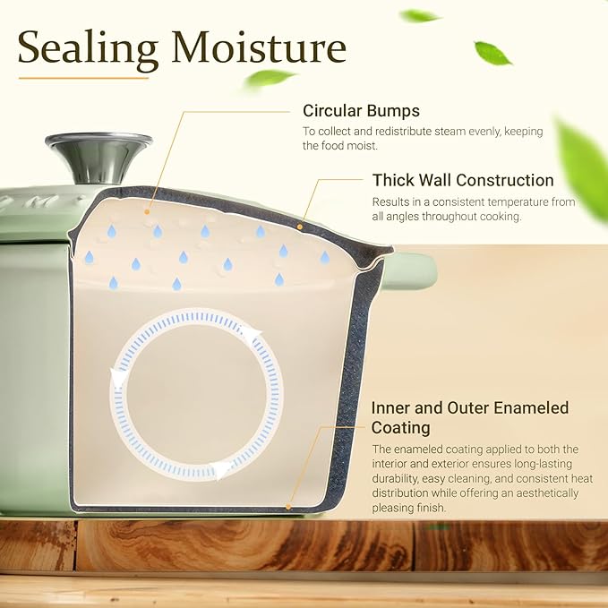 - Effortless Cleaning & Safety First: The flat and smooth enamel surface not only delivers a superior cooking experience but also makes cleaning a breeze. Easily remove food residues with a gentle wipe from a soft sponge or cloth. Additionally, we've included a cotton heat-resistant cap, ensuring a comfortable grip and safeguarding you from burns when handling the pot's handles and lid.