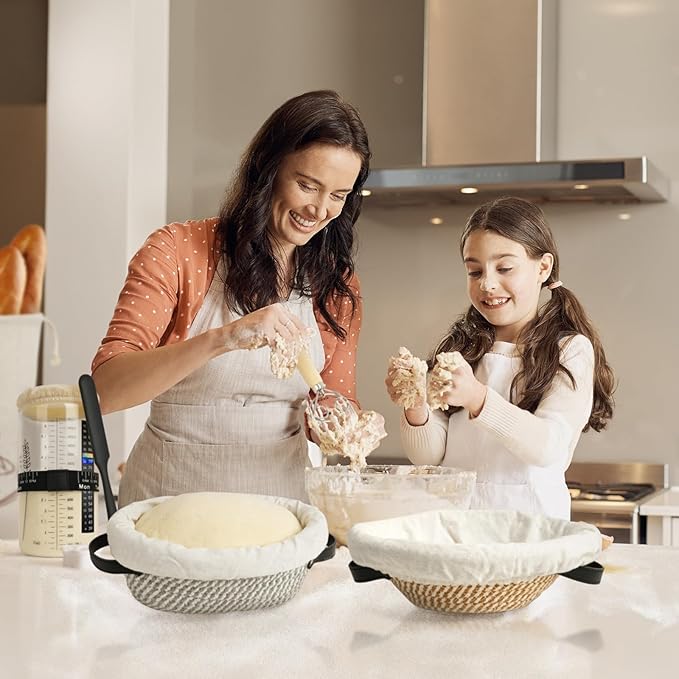 - Perfect Sourdough Bread Kit: 50oz glass starter jar with feeding day tracker, thermometer, and spatula to ensure a healthy sour dough starter. Round & oval cotton rope proofing baskets, bread lame, dough whisk, dough scraper, baking sling, bread bag, and luffa brush for effortless baking
