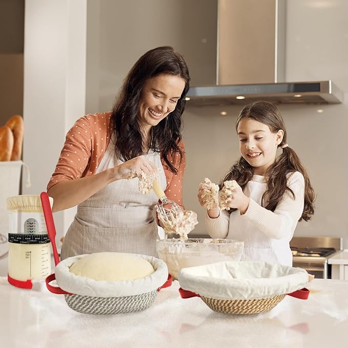 - Perfect Sourdough Bread Kit: 34oz glass starter jar with feeding day tracker, thermometer, and spatula to ensure a healthy sour dough starter. Round & oval cotton rope proofing baskets, bread lame, dough whisk, dough scraper, baking sling, bread bag, and luffa brush for effortless baking