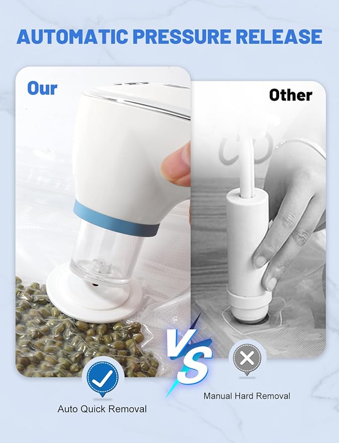- 【Wide Applications】Multifunctional food sealer vacuum sealer can be applied to vacuum bags, mason jars, wine bottles, vacuum storage containers, grain storage bags. Small vacuum sealer machine kit not only for kitchen meal preparation, food preservation after meals, but also for outdoor camping, picnics or as an great gift for food lovers.