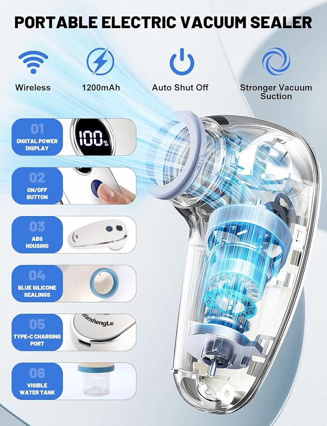 - 【Rechargeable & Digital Power Display】Wireless and rechargeable handheld vacuum sealer with built-in 1200mAh high capacity battery and long life span, fully charged in 30 minutes, strong vacuum suction capacity can complete the vacuum sealing process in 5 seconds. The LED display of the hand held vacuum sealer for food can show the specific power level as you need.