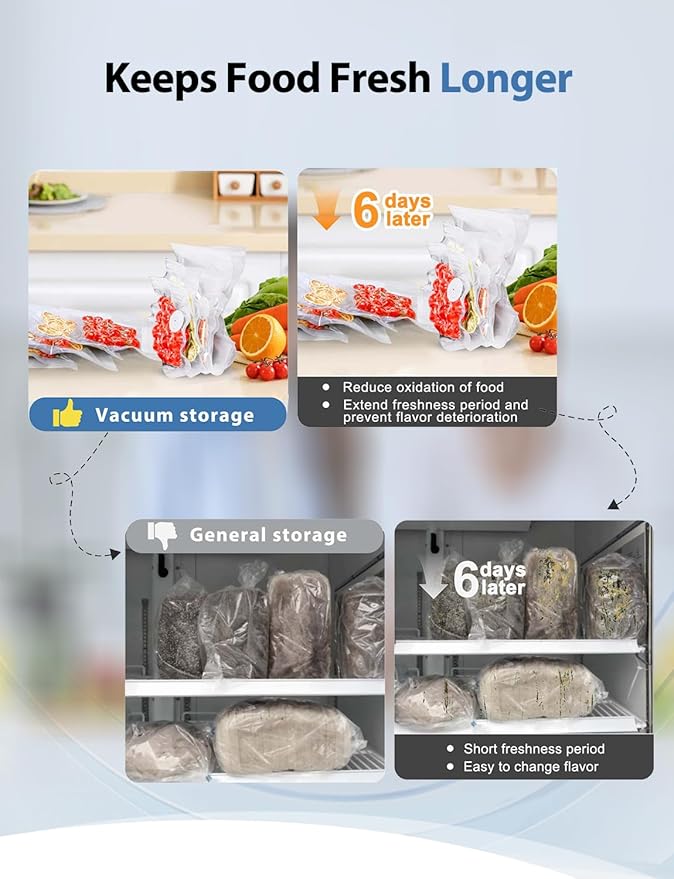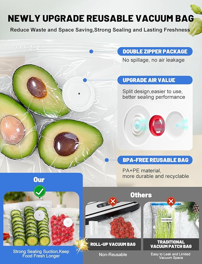 - 【Upgraded Vacuum Bags & Auto Stop Suction】Reusable vacuum sealer bags for food with upgraded sealing air pressure valve and thickened double sealing zipper, more capacity and better vacuum performance, the sous vide bag is made of food-grade PA + PE material, BPA-Free,reusable and easy to clean. Portable Vacuum sealer machine will stop operating automatically when finish sealing, extended machine lifespan and more efficient.