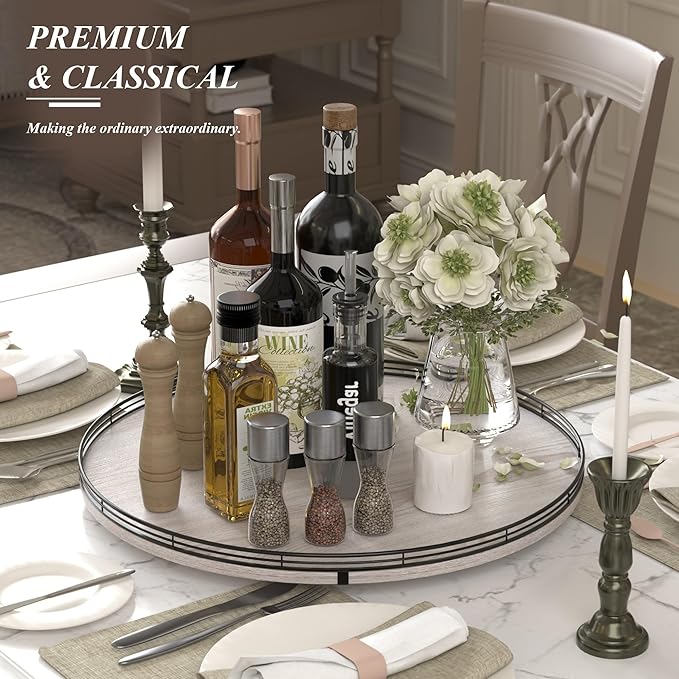 - PREMIUM MATERIAL: Our farmhouse large lazy Susan organizer is made of natural wood and strong Iron, sturdy, durable and premium quality. This wooden turntable organizer is a game-changer for keeping your kitchen organized. The farmhouse finish gives it a rustic, charming look that will fit perfectly with your kitchen decor.