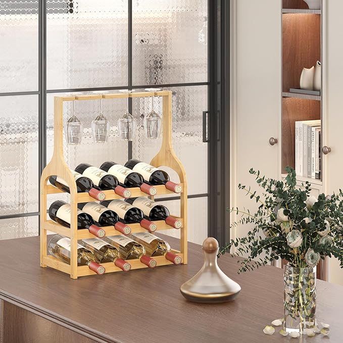 Wine Rack Countertop for 12 Wine Bottles and 4 Glass Holder, Small Bamboo Free Standing Racks Tabletop Display, Wooden Wine Storage Organizer for Cabinet Pantry Kitchen Bar Home Dining Room (Natural)