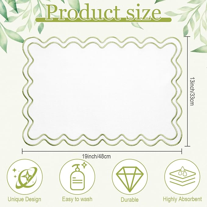 12 Set Linen Placemat 13x19 Wavy Embroidery Scalloped Placemat Double Layered Washable Farmhouse Dinner Table Mat Fabric Napkin for Christmas Hotel Restaurant Wedding Party(Grass Green)