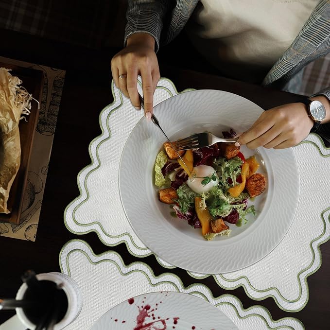 - Quality Material: crafted from linen fabric, these scalloped placemats are built to withstand daily wear and tear as well as special holiday meals; The material ensures that the wavy embroidered designs remain intact and vibrant
