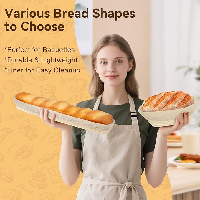 - WHAT YOU GET: The sourdough bread starter kit includes: a 9 Inch Round Proofing Basket, a 10 Inch Oval Proofing Basket, a 17 Inches Baguette bread proofing basket, 3 Linen Liners, a Silicone Bread Sling, a Silicone Baking Mat, a Dough Whisk, a Dough Scraper, 3 Bowl Scraper, a Bread Scoring Tool with 5 Blades, a Flour Duster, a Sourdough Jar kit, and a Cleaning Brush