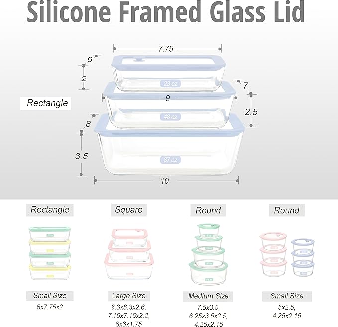 - ✅WHAT’S IN THE BOX: Each set comes with the Glass containers and their matching Silicone Framed Glass Lids. Rectangle Shape Size : 87oz, 48oz, 23oz, (8x10x3.15, 7x9x2.5, 6x7.75x2)