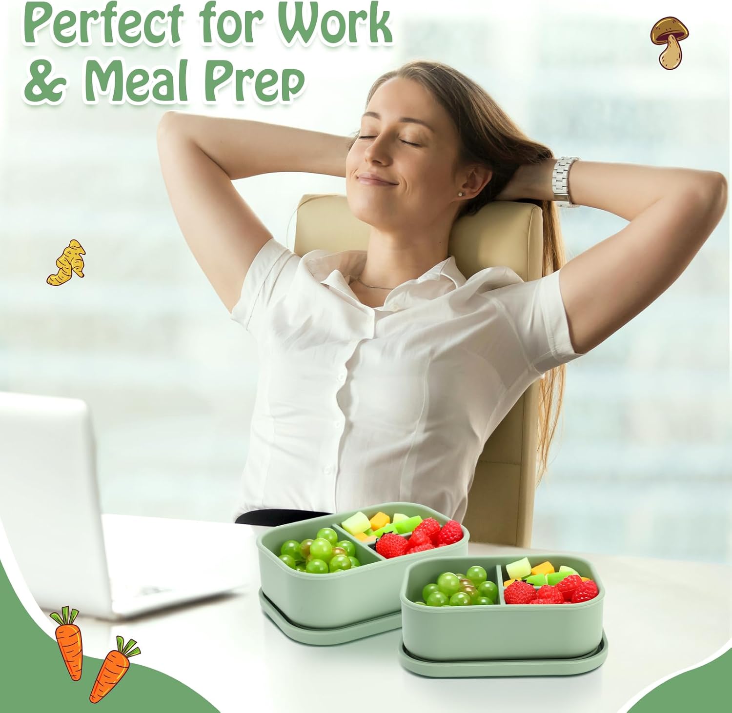 Honeydak 4 Pcs Silicone Bento Lunch Box 3 Compartment Reusable Leakproof Silicone Bento Lunch Container for Adults Microwave Dishwasher Freezer Safe(Olive Green)