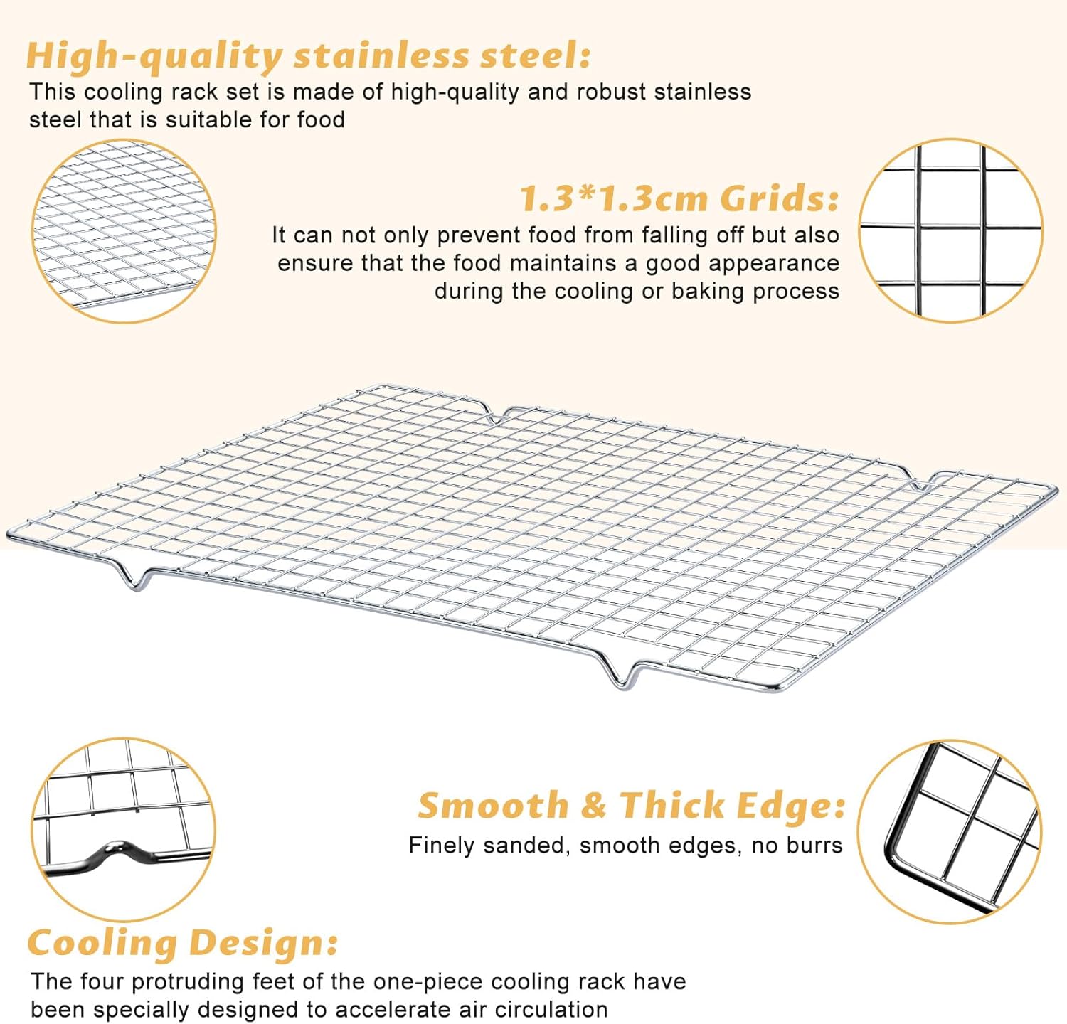 - Ultimate Baking Sheet Set: This premium baking set includes 2 heavy-duty baking sheets (17" x 11" x 0.5") and 2 versatile cooling racks (14" x 11" x 0.51"), designed to fit standard ovens and toaster ovens effortlessly. Ideal for roasting bacon, crisping chicken, baking cookies, pastries, brownies, breads, and fruit pies, or cooling desserts to perfection.