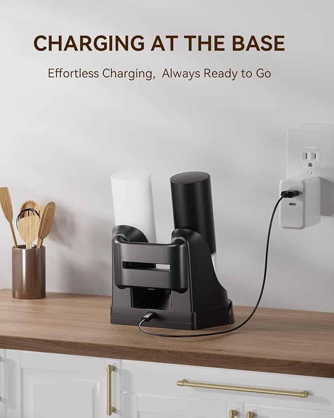 - Dual Charging Base: Our electric salt and pepper grinder set comes with a dual charging base, just place the grinder on top and you can start charging 2 grinders at the same time