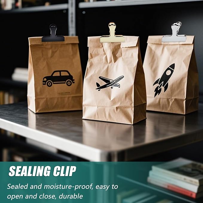 - 【WIDE APPLICATION】The sealing clips can be used at home, work, office, and school. You can use the bag clips to seal food packaging bags in the kitchen, or you can use the chip bag clip to hang recipes, photos, etc. The strong chip clips are perfect for posting photos, notes, shopping lists, hanging kitchen supplies, etc., metal clips are both beautiful and practical