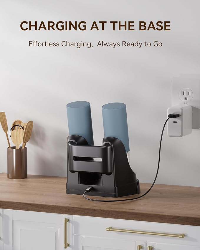 - Dual Charging Base: Our electric salt and pepper grinder set comes with a dual charging base, just place the grinder on top and you can start charging 2 grinders at the same time