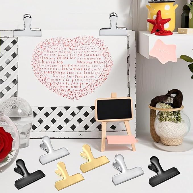 - 【WIDE APPLICATION】The sealing clips can be used at home, work, office, and school. You can use the bag clips to seal food packaging bags in the kitchen, or you can use the chip bag clip to hang recipes, photos, etc. The strong chip clips are perfect for posting photos, notes, shopping lists, hanging kitchen supplies, etc., metal clips are both beautiful and practical