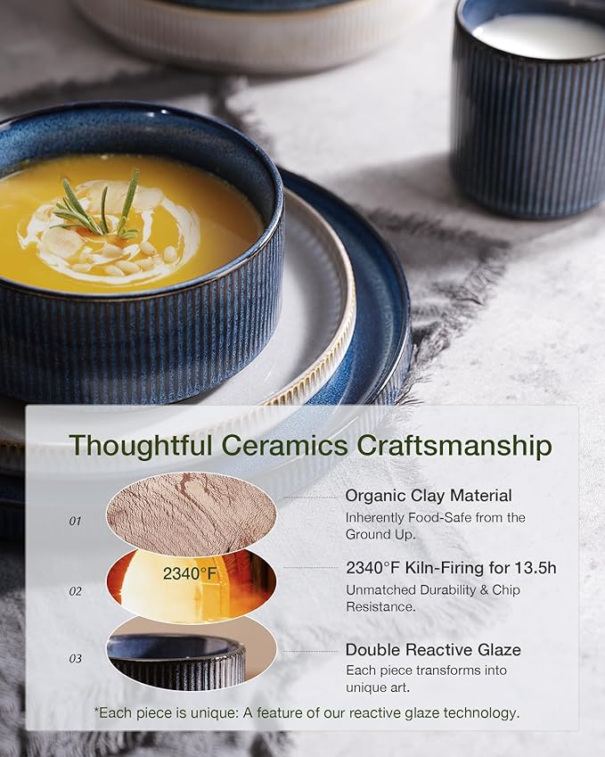 - [Everyday dinnerware]: Our premium stoneware dinnerware crafted from organic and natural clay, is LEAD-FREE and CADMIUM-FREE. It ensures safety for both your family and the environment. You can savor all kinds of meals, including steaks, salads, and desserts, with complete confidence