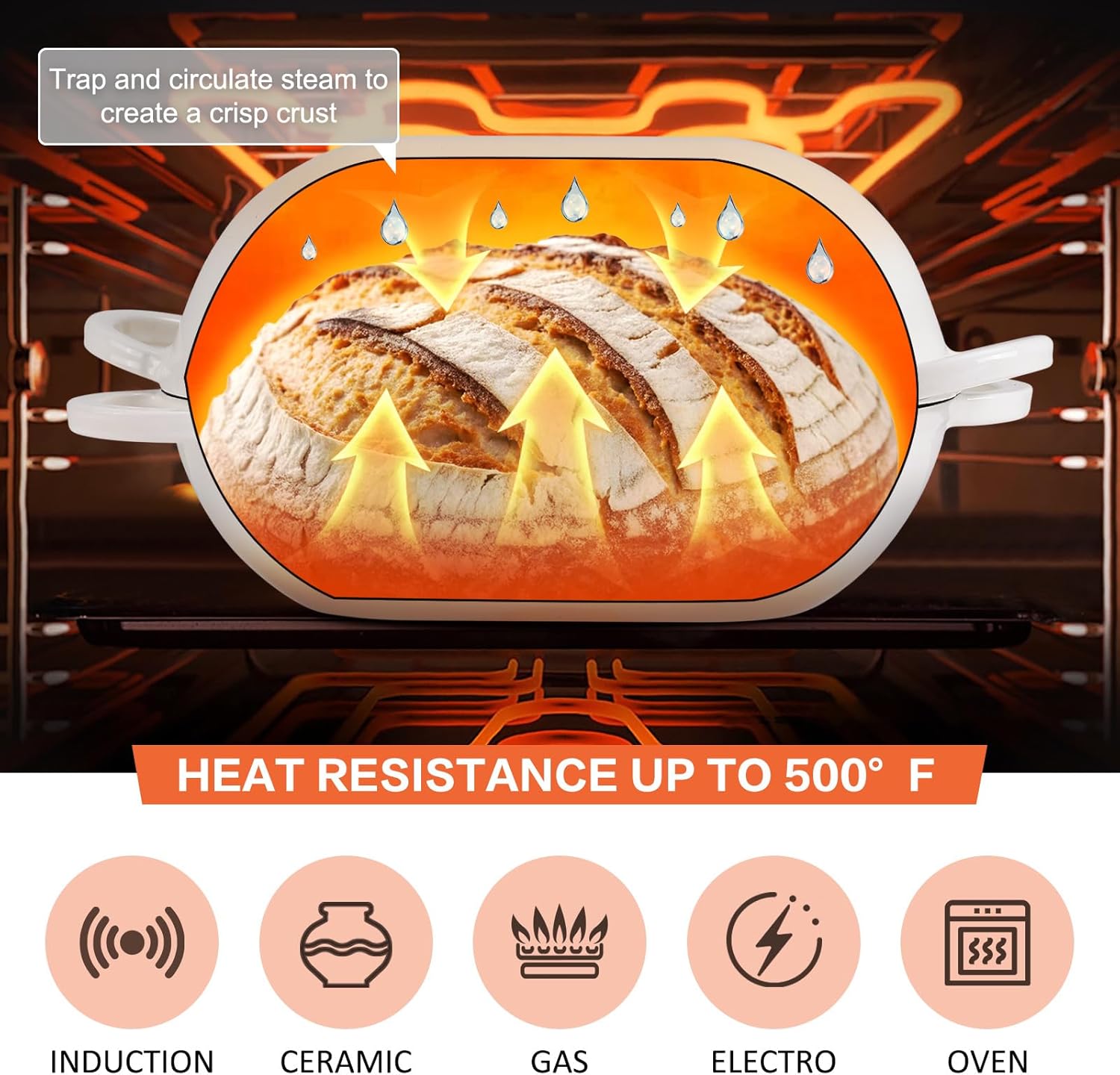 - Feature: The oval dome lid of this oval bread oven traps steam released during baking to produce a caramelized, crispy crust, preventing the crust from curdling, drying out or baking too quickly before rising. The ergonomic handles make lifting easy and comfortable