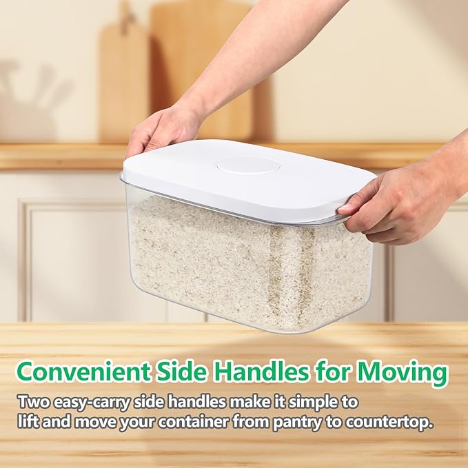 - USER- FRIENDLY RICE CONTAINER: Push-button on lid makes opening and seal easy, also serving as a handle to take the lid with one hand. The big mouth and the convenient measuring cup allow to grab ingredients easily