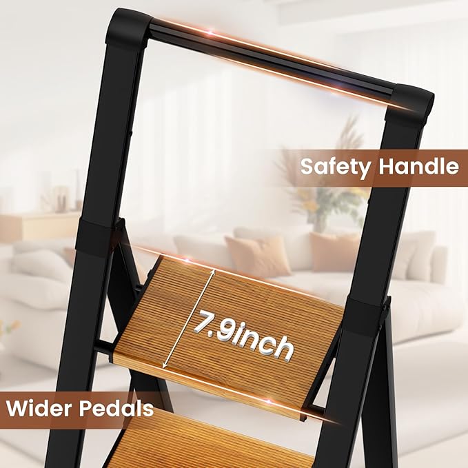 - ERGONOMIC DESIGN: The raised handrails on top provide extra stability when climbing up and down the step ladder at home. The 7.9-inch wide non-slip pedals ensure confidence while stepping on the ladder, and non-slip rubber feet enhance safety while protecting floors from scratches