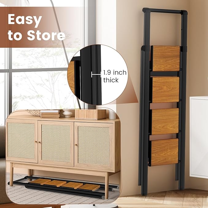 - EASY TO STORE: The stepladder is only 1.9 inches thick when folded, it can be flexibly beside cabinet, behind door, under bed, or wall-mounted. Suitable for various scenes such as home kitchens garages storage rooms and offices, cleverly utilizing small spaces to free up more living space for you