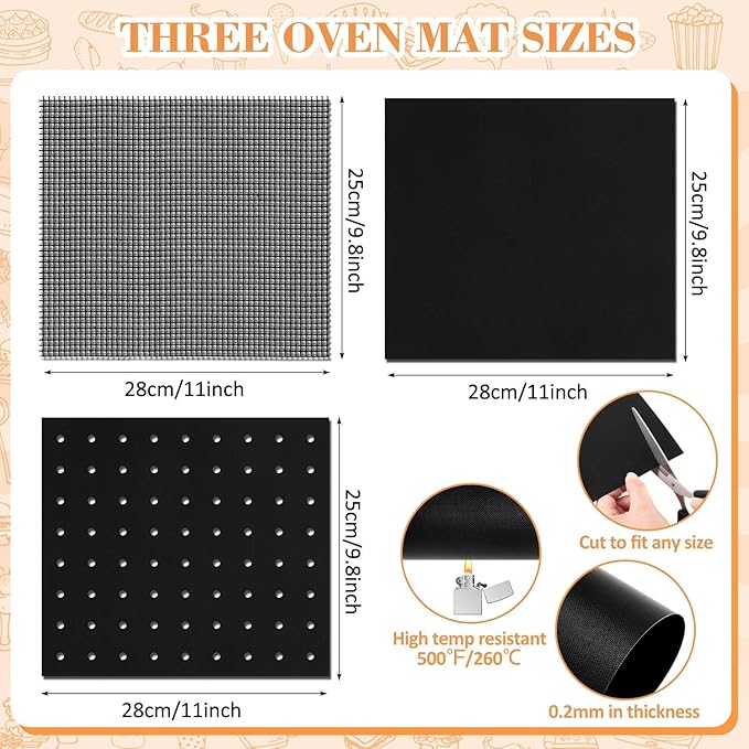 - Three Baking Mats Set: perforated mat allows even air circulation, keeps the basket clean and protected from grease and sticky food residue; Mesh mat is good for cooking those smaller foods to prevent small pieces of food from falling through the cracks of the oven rack; Baking mat fits on the bottom of the toaster to catch all food drips or to cook sticky foods, keeping the tray and rack clean