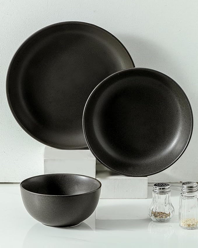 3 Piece Dinnerware Set, Stoneware Plate and Bowl Set, Ceramic Serveware Set, Scratch Resistant, Dishwasher & Microwave Safe, Matte Black